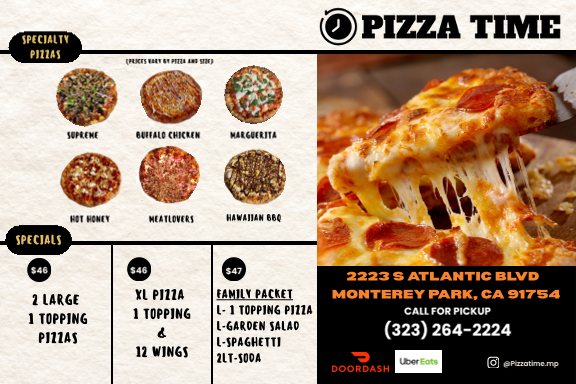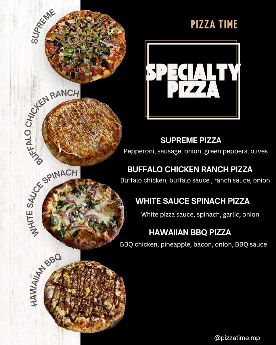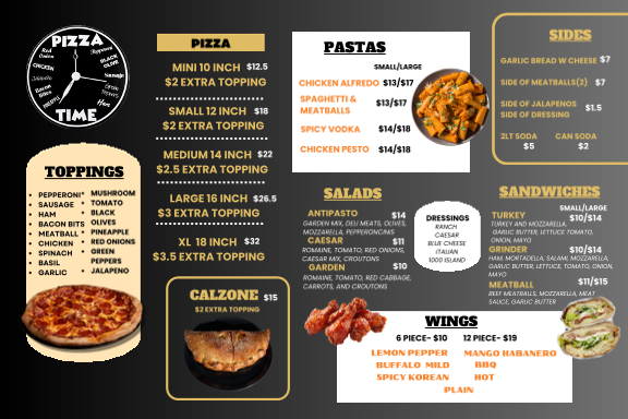 Pizza Time offers a straightforward, homey menu that focuses on classic pizza favorites alongside hearty pastas and fresh salads. The selection is designed for casual dining, whether you're grabbing a bite with friends, settling in for a family meal, or picking up something satisfying after a long day.